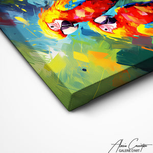 Our colorful bird painting is an explosion of life and color, a framed piece of sky that brings light and energy to any room. Each bird is a journey to a distant destination, a call to adventure.