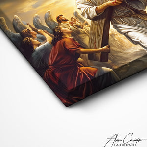 Our biblical painting depicts Jesus at the heart of a scene imbued with symbolism, His presence radiating from the center of the composition. Our painting invites contemplation and recalls the very essence of the Gospel. It brings a sacred and reverent atmosphere to any interior.