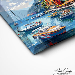 Our abstract seaside painting reinterprets the beauty of the coastline with refined shapes and harmonious colors. Between shades of deep blue and touches of pastel red, it evokes the sea and its horizons in a modern and artistic style.