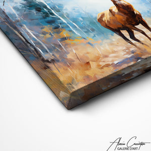 Our deer painting is a work that celebrates the peaceful beauty of nature and the majestic presence of the deer in the heart of the forest. This painting, rich in details and harmonious colors, captures an ephemeral moment where the deer, a symbol of nobility and grace, blends into the forest landscape that surrounds it.