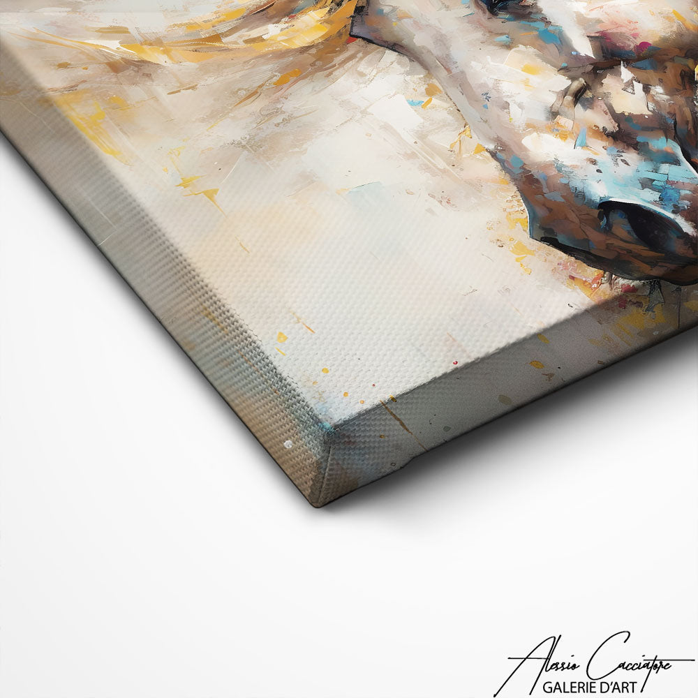 This white horse painting embodies purity and nobility, capturing the majestic elegance of the animal in a striking composition. The subtle details and luminous hues bring a sense of grace and freedom to your space, perfect for a refined and timeless decoration.