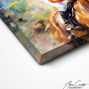 The composition of this racehorse painting highlights the natural symmetry of the horse, with its flowing lines that emphasize the grace and harmony of this creature in motion.