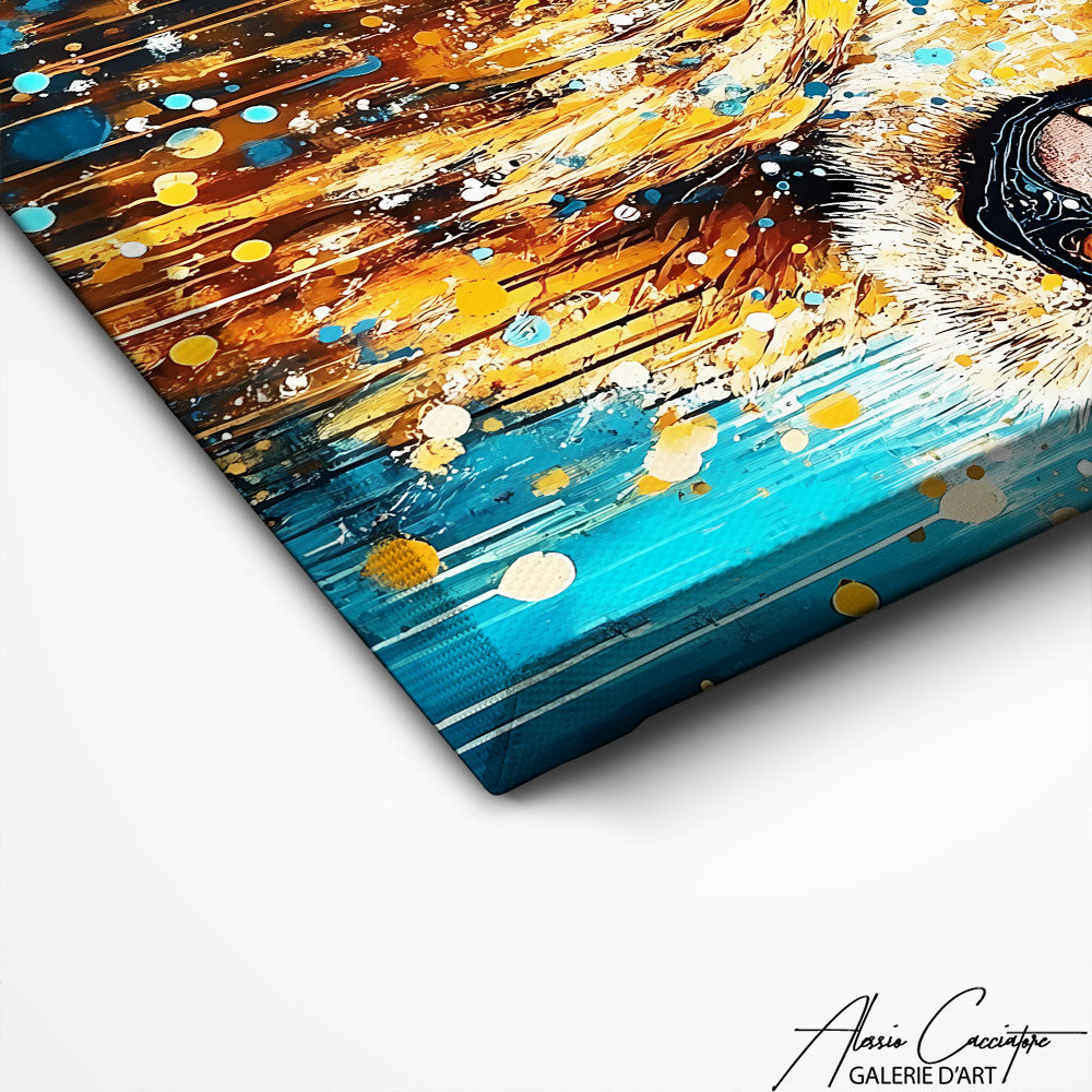 Our abstract color painting reveals a majestic lion in profile! This regal work transforms your decor into a gallery of noble abstract animal art. The presence of the king of beasts is enhanced by modern art. Feline art that reigns supreme in your space!