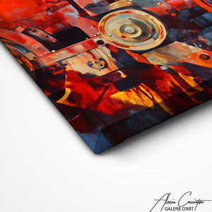 Our industrial wall art showcases a stylized wheel in red and blue hues, in a raw and graphic composition. The metallic designs and powerful contrasts evoke the mechanical and urban world. Perfect for a loft, workshop, or modern interior. This wall art brings character, energy, and a technical touch to your decor.