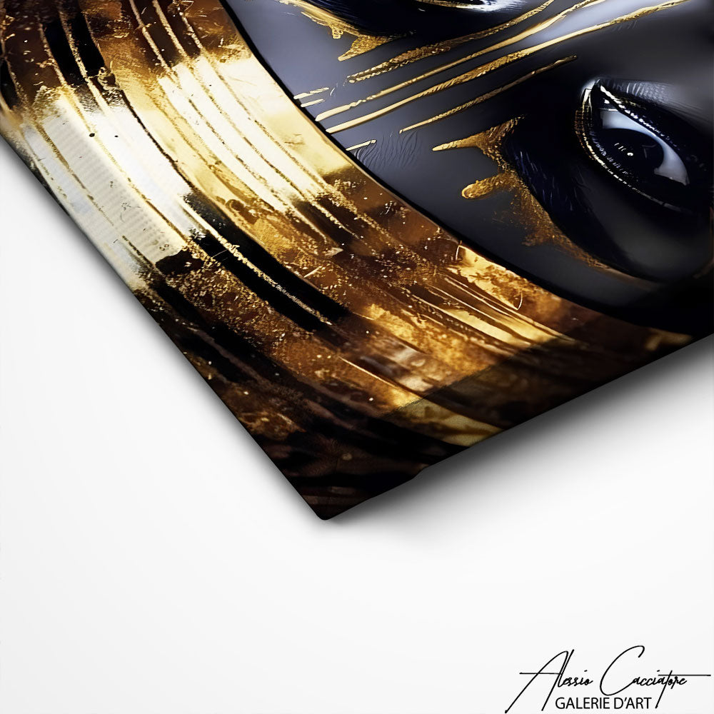 Golden glow meets deep shadows, creating a mesmerizing contrast that highlights the beauty and dignity of the subject in this black and gold African woman painting.