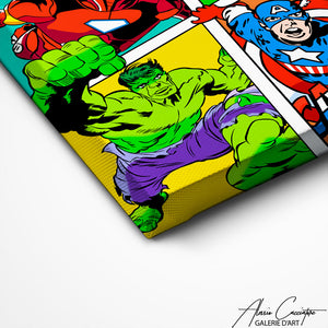 The artist pays homage to the icons of Marvel culture, highlighting them with bright colors and bold design. This Marvel painting is a celebration of popular culture.