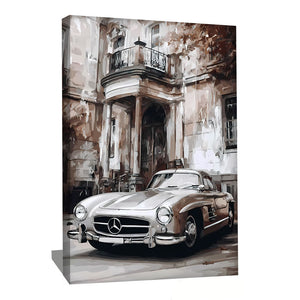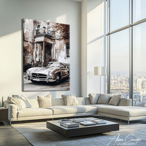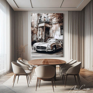 Our Mercedes 300 SL painting showcases a luxury retro car in an abstract style. Powerful and refined, it exudes prestige and timelessness. An ideal choice for car enthusiasts and chic design enthusiasts.
