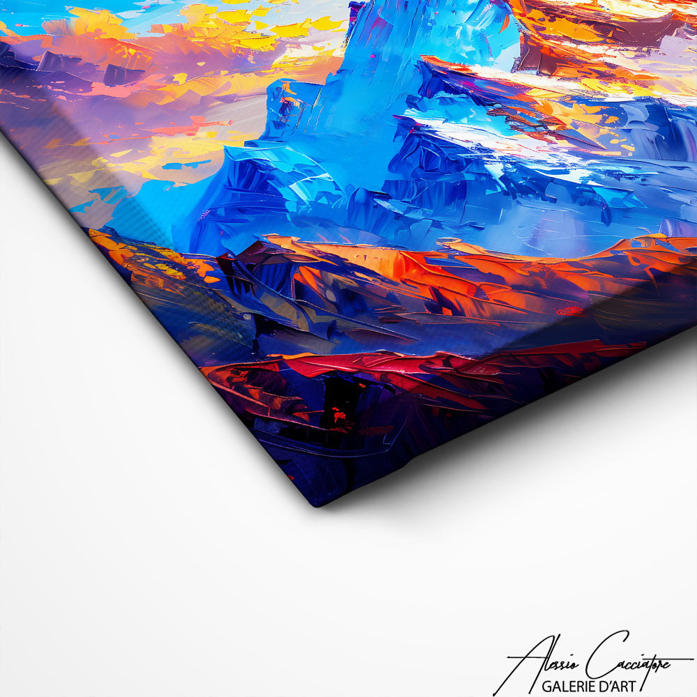 Our Swiss mountain painting captures the grandeur of the Alpine peaks with majestic landscapes and vibrant colors. Perfect for a refined decoration, it invites you to escape and experience the serenity of the Swiss heights.