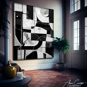 This contemporary abstract black and white painting brings a touch of elegance and simplicity to your interior, with its marked contrasts and refined design. Perfect for a modern and sophisticated decor.
