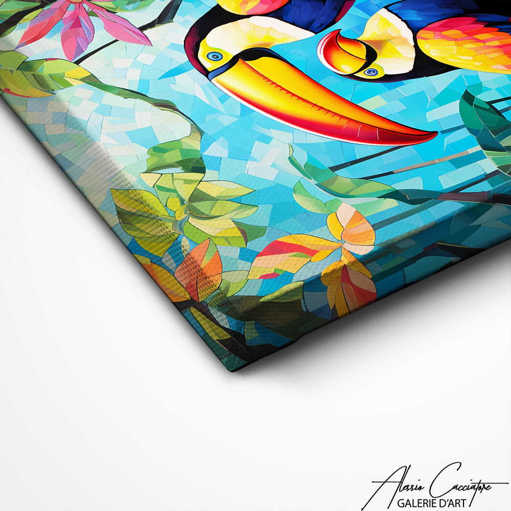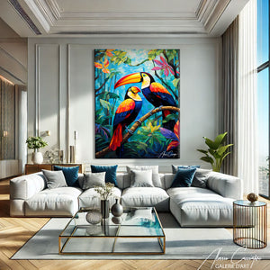 Explore the mystery of the tropics with our exotic birds painting , a centerpiece that brings a touch of escape and natural beauty to any living space. Its colors and striking realism captivate and transport the observer to a faraway paradise.