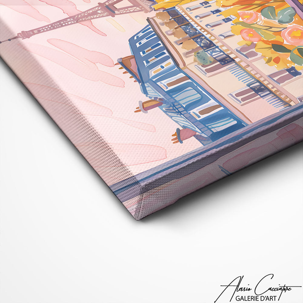 Our pink Paris painting revisits the City of Lights with soft, romantic hues, bringing a warm and poetic ambiance to your home. The Eiffel Tower, Parisian streets, and iconic monuments are adorned with pastel shades, creating an elegant and soothing atmosphere. Its subtle, modern style makes it a perfect piece for lovers of Paris and romantic design.