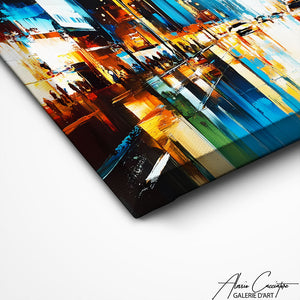 Plongez dans l’intensité d’une grande ville à la nuit tombée avec notre tableau paysage urbain. Les reflets de lumière sur la chaussée, les gratte-ciel élancés et les tons bleu-or créent une atmosphère captivante. Parfait pour un intérieur moderne, il évoque l’énergie et la sophistication des métropoles.