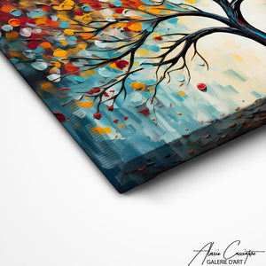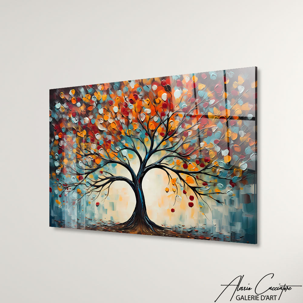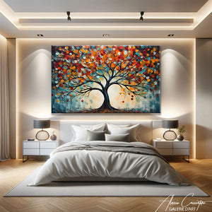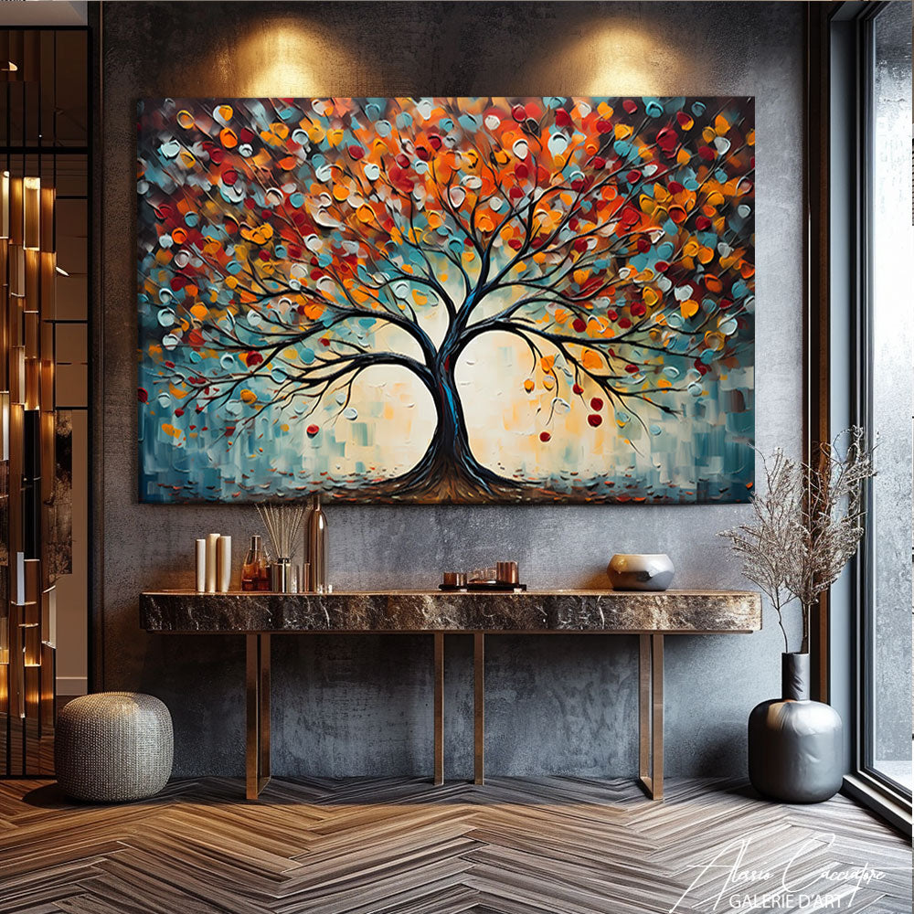 Our Tree of Life painting is a visual celebration of nature and balance, where each leaf bursts into a warm autumn palette, evoking strength, rebirth, and universal connection. Ideal for creating a calming and inspiring atmosphere, this painting is a symbolic centerpiece for meaningful wall decor.