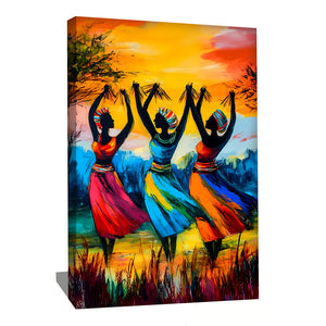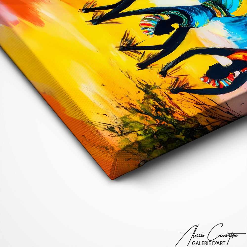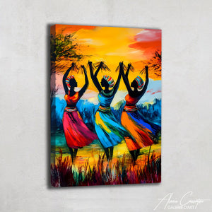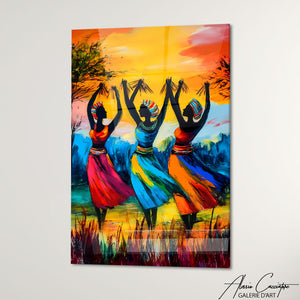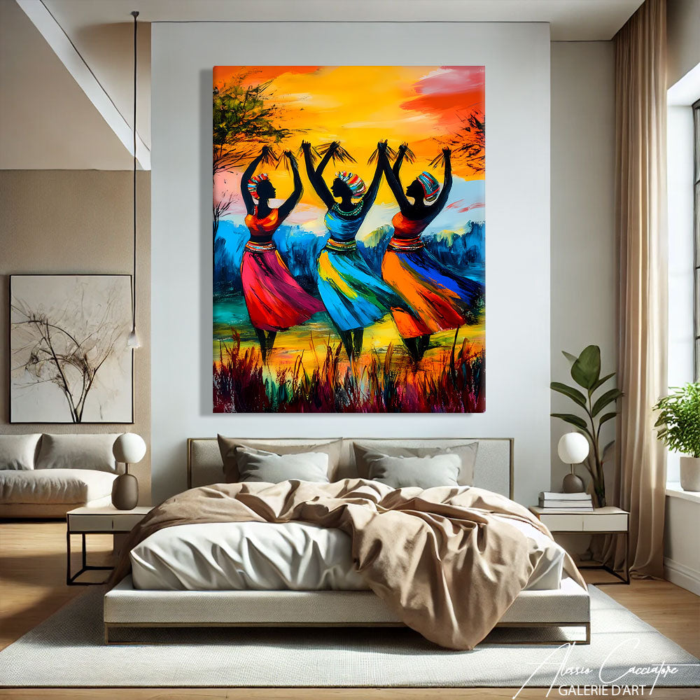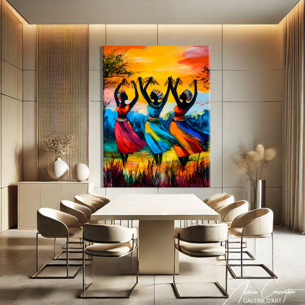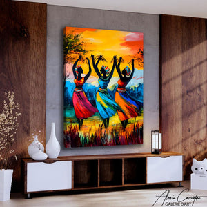 Our African-style painting depicts three women in traditional attire dancing in an abstract style. Colorful and expressive, it brings energy and life to your walls. Ideal for infusing warmth and dynamism into your decor.