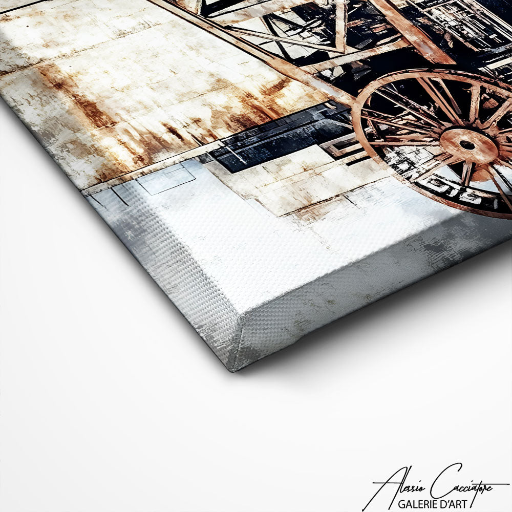 Our vintage industrial-style painting features an imposing factory wheel, a nostalgic reminder of the mechanical era. The patinated details and sepia tones enhance this iconic piece of industrial heritage. An authentic piece that brings character and historical depth to your home, ideal for lovers of raw decor and objects steeped in history.
