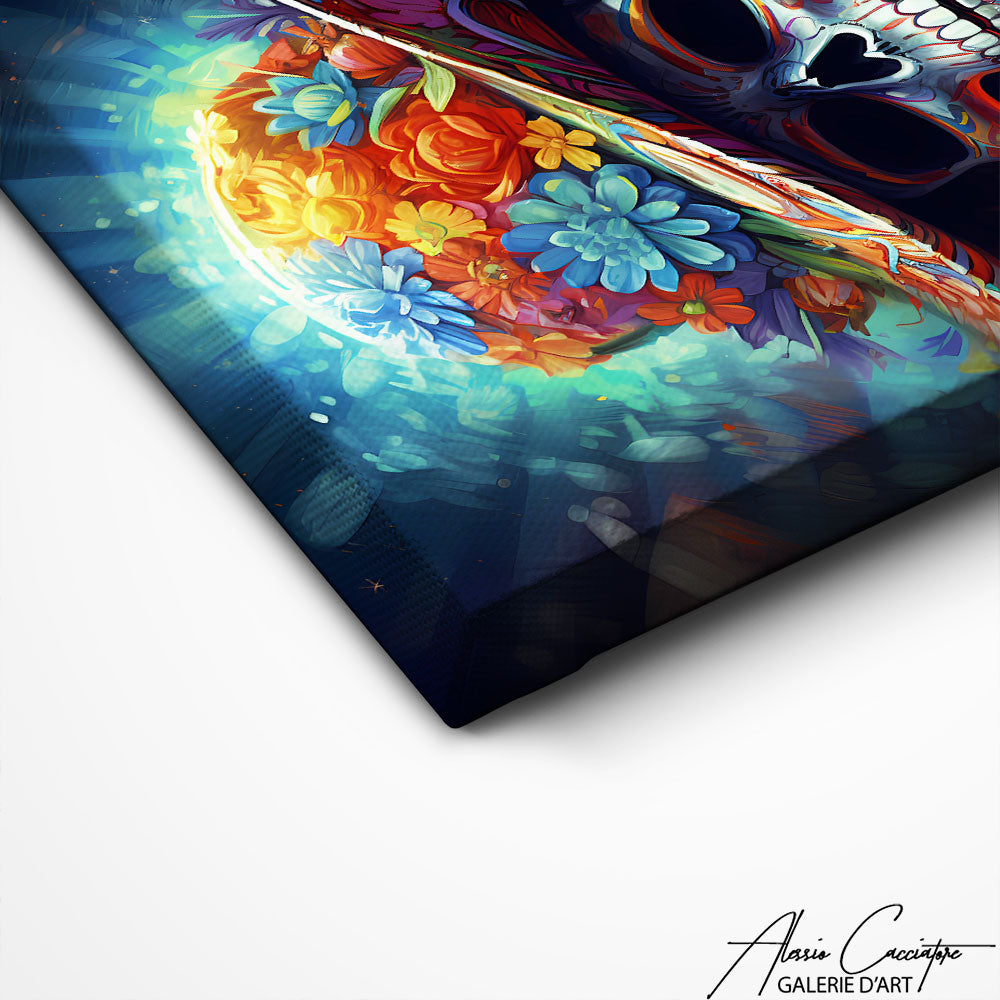 Our colorful skull painting is a celebration of life through art. The vibrant colors and bold patterns bring a new dimension to the symbolism of the skull, making it a captivating piece for any modern space.