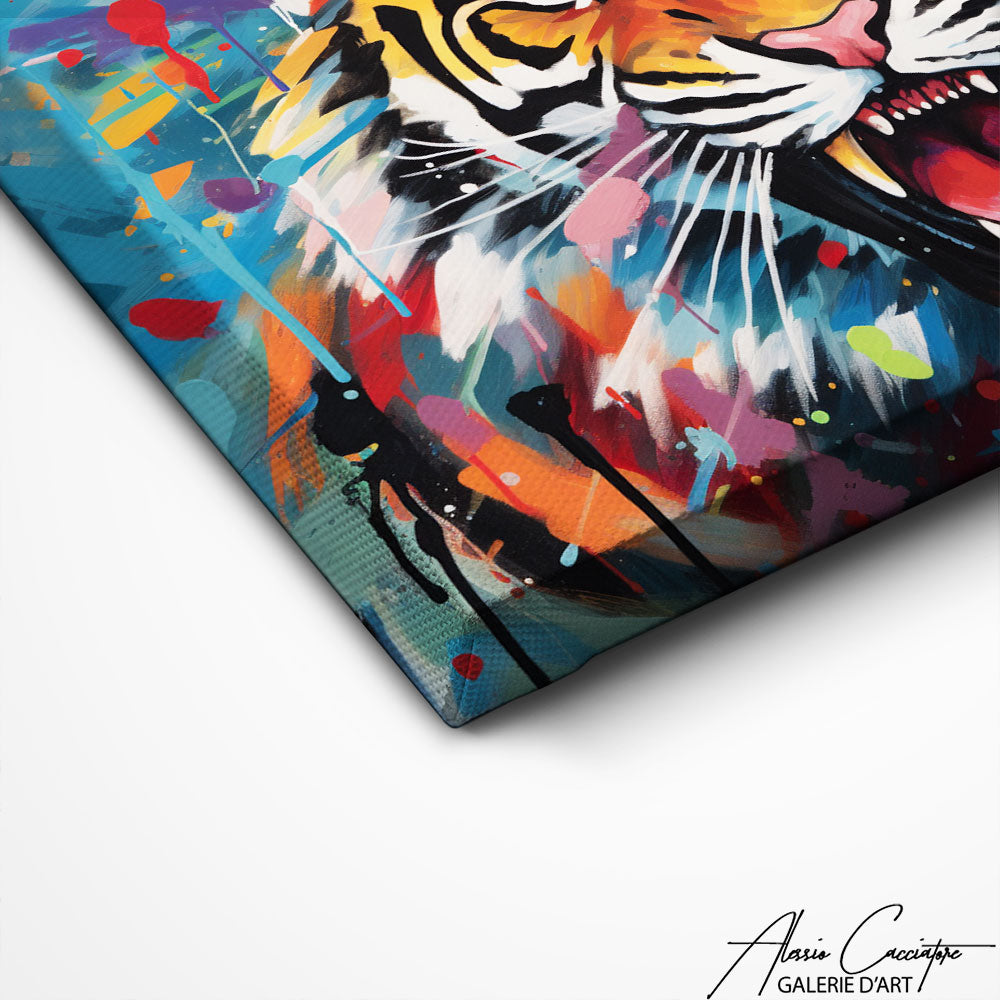 This multi-colored tiger painting is an explosion of color and life. Every detail brings new energy to the image, making it a vibrant center of attention for any room.