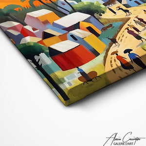 This meticulously crafted painting of an African village offers a charming and lively vision of this village. Using an earthy color palette, the artist brilliantly captures the daily life and community in harmony.
