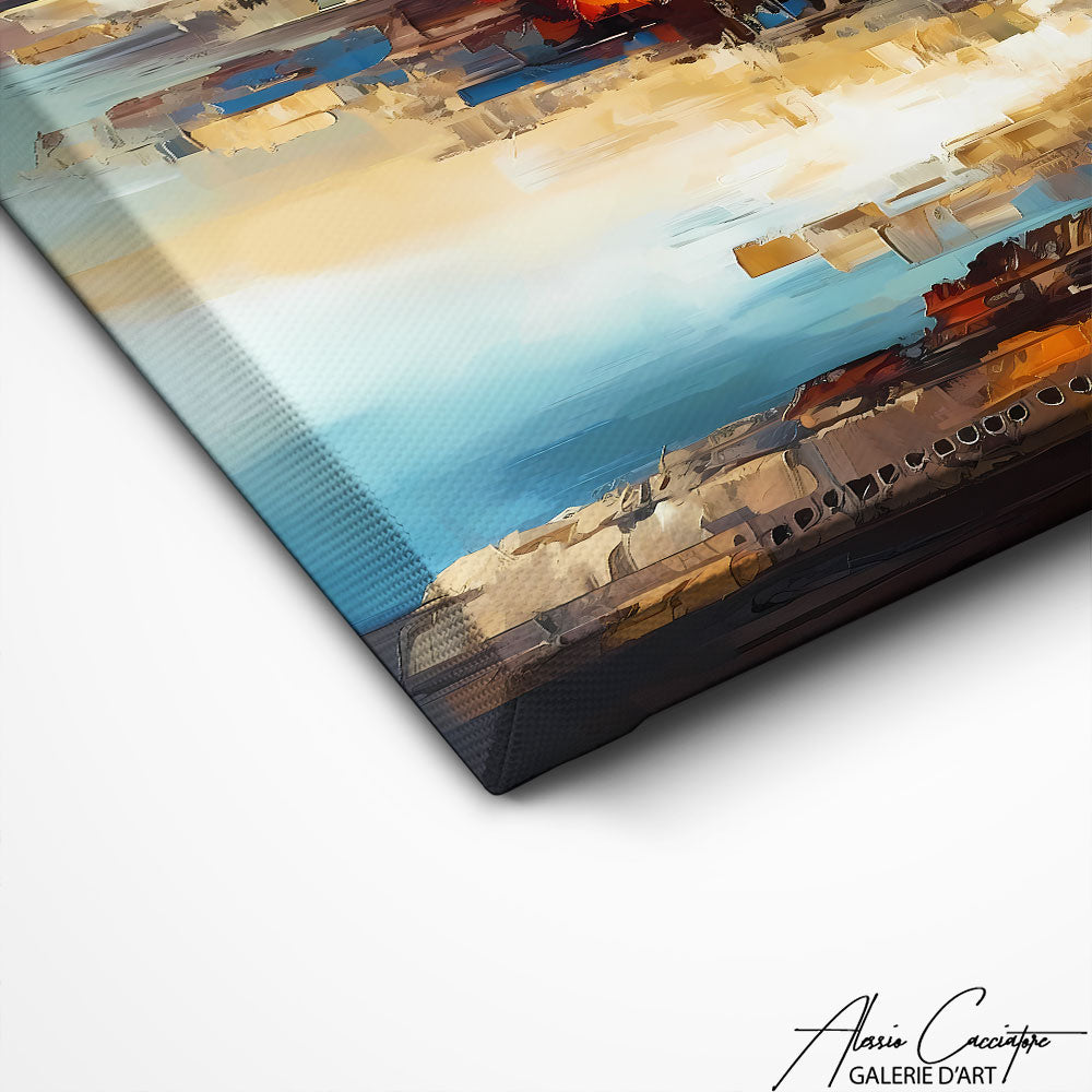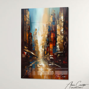 Our painting depicts New York in an abstract style, blending stylized architectural lines with bursts of urban color. The work captures the city's bustle and density without freezing its contours. Perfect for a modern and dynamic decor. This painting evokes the unique rhythm of the metropolis at a glance.