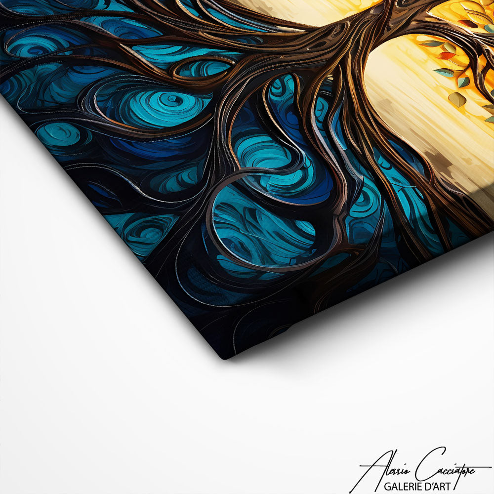 Dans un style acrylique, l'Arbre de vie est mis en lumière avec une clarté et une vivacité exceptionnelles, offrant une œuvre d'art durable et impressionnante. Un choix magnifique pour ceux qui apprécient la précision et la richesse des détails dans l'art.