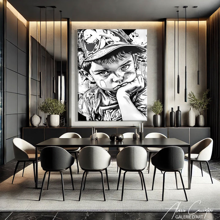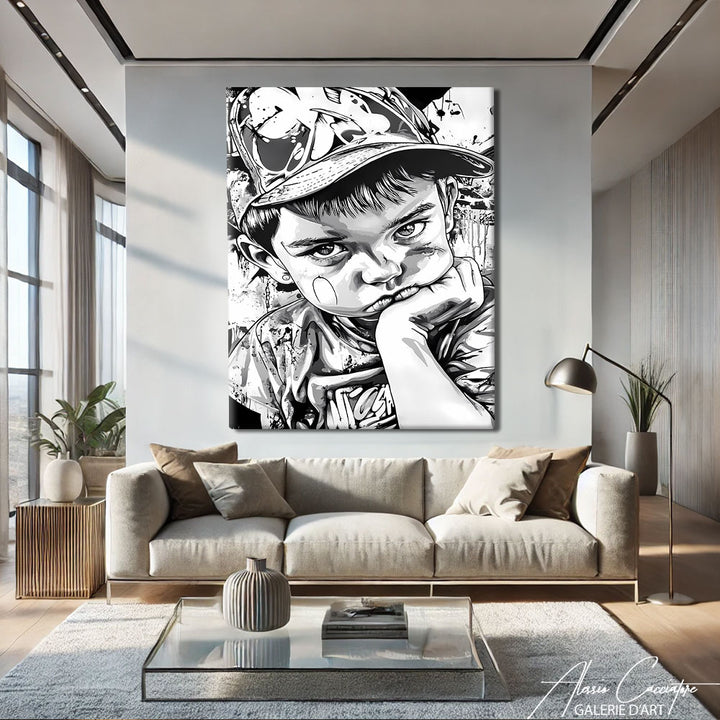 Notre tableau street art en noir et blanc représente un enfant qui boude, capturé avec réalisme et une touche d’ironie propre à l’art urbain. L’absence de couleur renforce l’émotion du regard et donne à la scène une force silencieuse. Parfait pour une déco moderne, brute et expressive. Ce tableau mêle tendresse, attitude et réflexion avec subtilité.