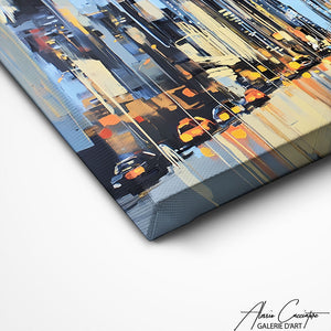 Notre tableau triptyque représente une scène urbaine moderne, structurée par de hauts immeubles et des reflets lumineux sur la chaussée. Les trois panneaux créent une perspective profonde qui allonge visuellement l’espace. Les contrastes de couleurs donnent du rythme et une vraie présence murale. Idéal pour une salle à manger contemporaine recherchant caractère et élégance.