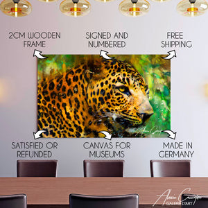 Plongez dans l'univers fascinant de l'art animalier pour votre décoration murale avec tableau léopard prestigieux, une œuvre riche en détails.