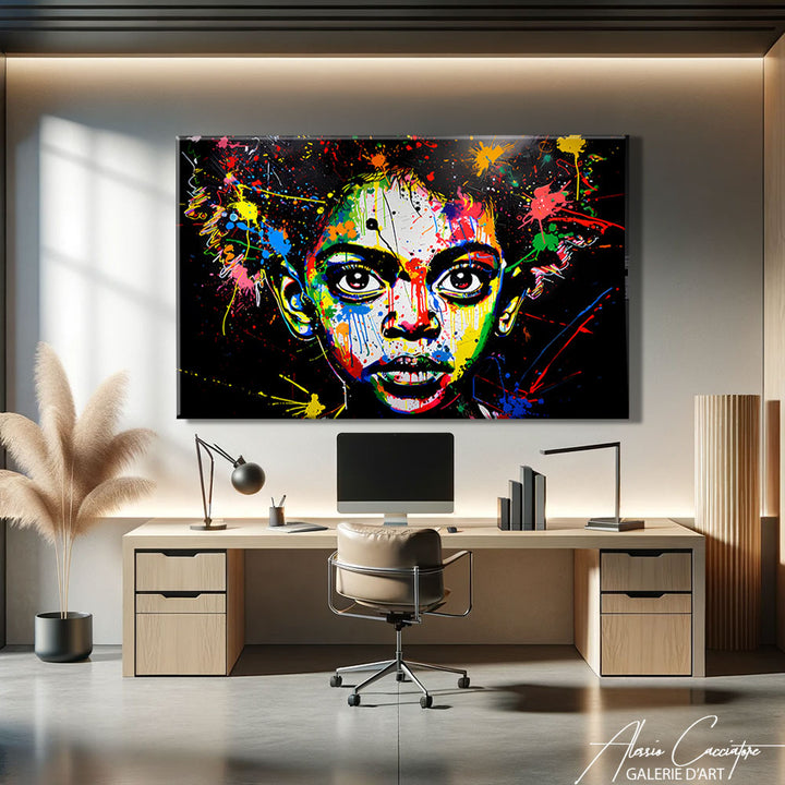 Notre tableau street art moderne représente un petit enfant dans un style pop art coloré et urbain, mêlant innocence et énergie créative. Les touches graffiti et les contrastes dynamiques donnent à l’œuvre une dimension à la fois tendre et percutante. Idéal pour une déco contemporaine pleine de vie et d’émotion. Ce tableau apporte fraîcheur, originalité et un regard attendrissant sur l’art urbain.