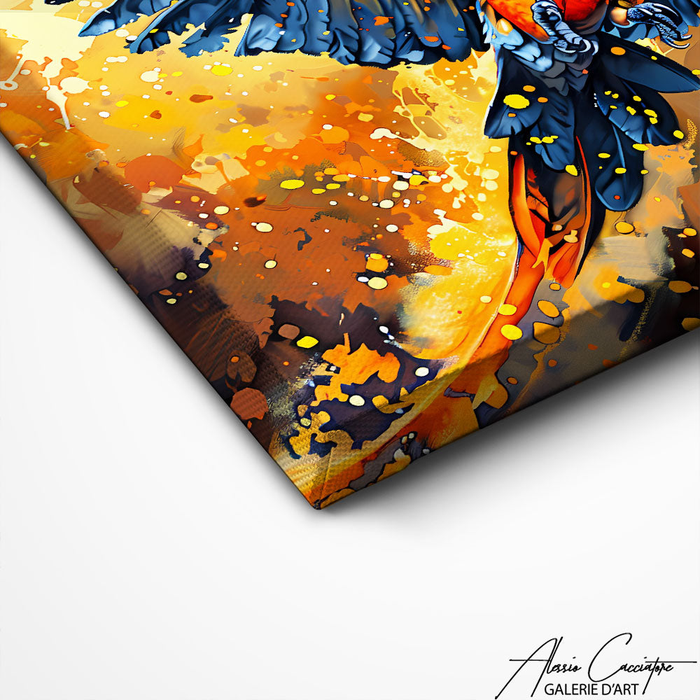 Ce grand tableau perroquet, avec ses dimensions imposantes et ses couleurs éclatantes, devient le point focal de votre pièce. Idéal pour créer un impact visuel fort dans un salon ou une entrée spacieuse.