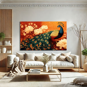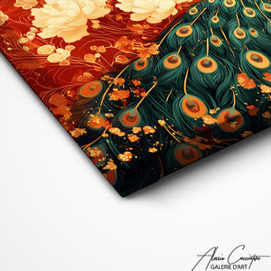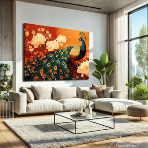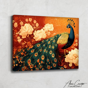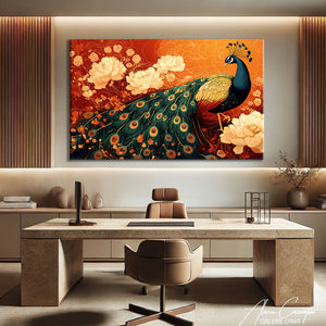 Notre tableau de paon en style chinois traditionnel apporte raffinement oriental et symbolisme profond à votre intérieur. Parfait pour un bureau, il crée une atmosphère de sérénité et de noblesse. La composition équilibrée, caractéristiques de l'art chinois, subliment la majesté de cet oiseau porteur de chance.