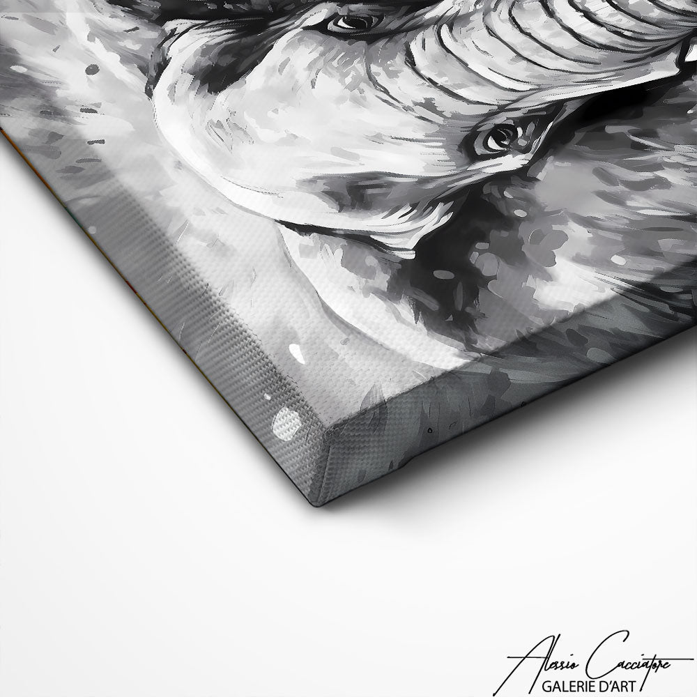 Le choix du monochrome intensifie la puissance et l'émotion de cette œuvre. Dans un jeu d'ombres et de lumières, ce tableau éléphant se révèle avec une intensité dramatique, offrant une perspective profonde et captivante.
