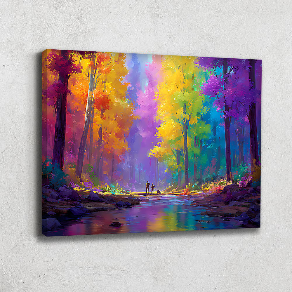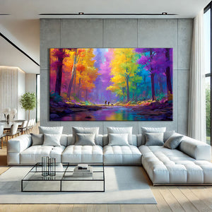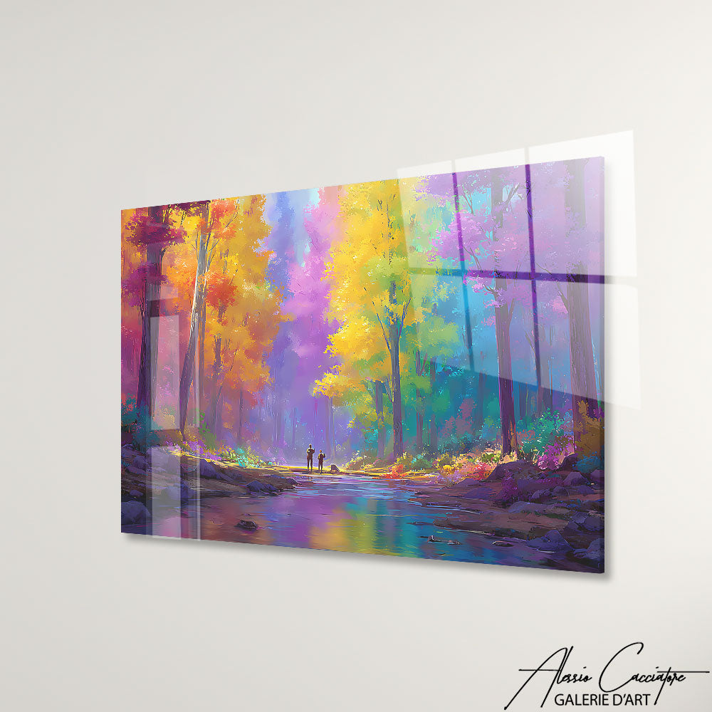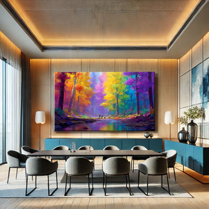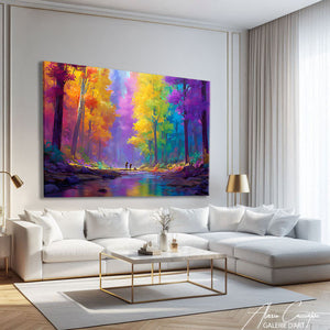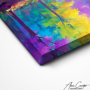 Notre tableau forêt moderne illustre un paysage multicolore abstrait. Dynamique et expressif, il mêle nature et art contemporain. Parfait pour donner énergie et modernité à votre intérieur.