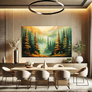 Notre tableau forêt grand format illustre une forêt enneigée baignée par un coucher de soleil. Poétique et apaisant, il dégage une atmosphère douce et lumineuse. Idéal pour apporter sérénité et élégance à votre décoration intérieure.