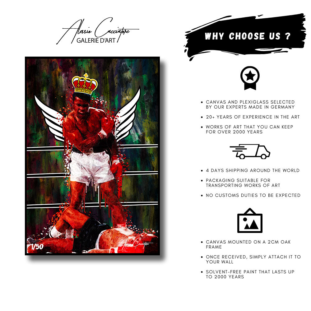 Notre tableau Mohamed Ali Moderne transcende la légende avec ses ailes majestueuses et sa couronne royale. Cette œuvre épique sublime un salon prestigieux ou un bureau en apportant grandeur et inspiration divine. Le champion ailé fascine par son symbolisme puissant mêlant gloire sportive et spiritualité. Idéal pour créer une décoration motivante qui célèbre le dépassement de soi et l'excellence absolue.