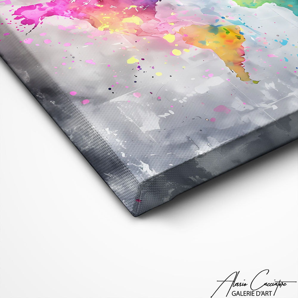 Notre tableau carte du monde combine art et géographie, offrant une représentation artistique des continents et des océans. Idéal pour ceux qui souhaitent incorporer une touche éducative et esthétique à leur intérieur.