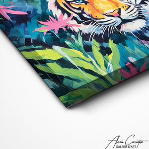 Embrassez la vivacité avec ce tableau de tigre en couleur, un tableau qui célèbre la puissance et la vitalité du tigre à travers une palette de couleurs audacieuses et expressives.