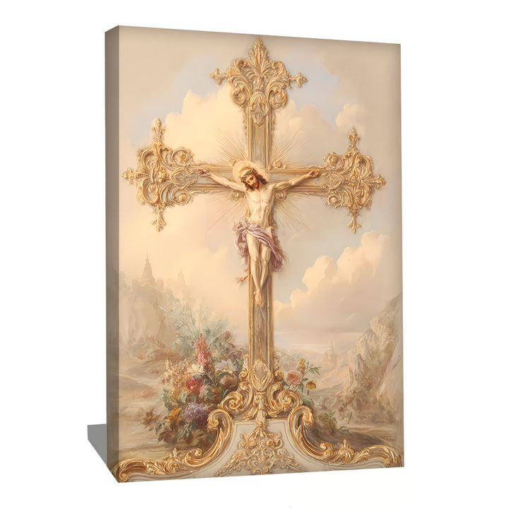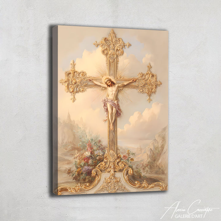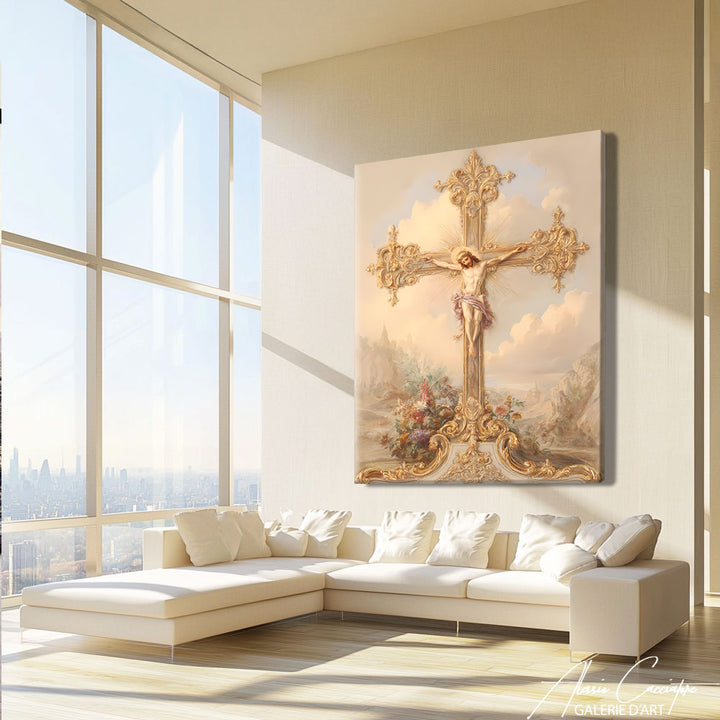 Notre tableau ancien représente une croix dorée finement travaillée, portant la silhouette sacrée de Jésus dans une posture empreinte de paix et de solennité. Les détails dorés et l’esthétique classique évoquent la tradition religieuse avec noblesse et recueillement. Idéal pour un coin prière ou une décoration spirituelle discrète. Ce tableau ajoute une présence sacrée et apaisante à tout espace intime.