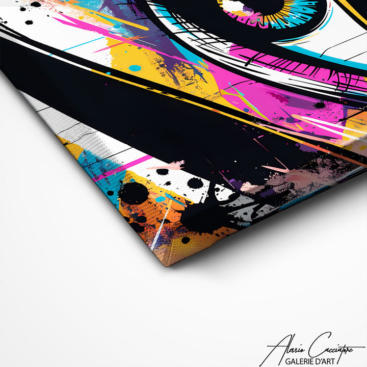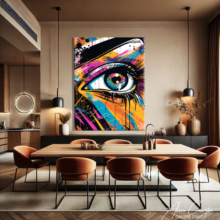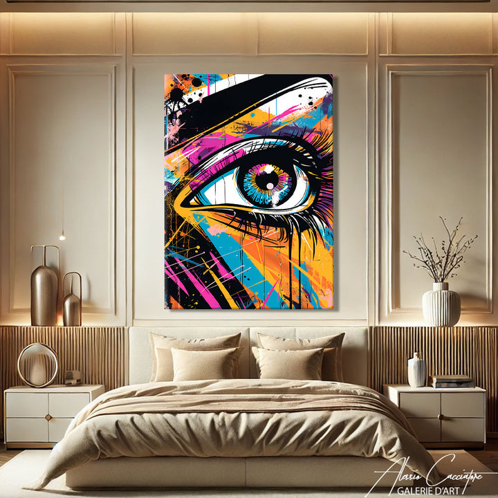 Ce tableau pop art met en lumière un œil bleu saisissant, entouré d'effets graffiti et de couleurs éclatantes typiques du street art. À la fois mystérieux et expressif, ce regard capte l’attention et donne une âme unique à votre mur. Parfait pour une décoration moderne, urbaine et intrigante. Ce tableau mélange émotion, intensité visuelle et style graphique assumé.