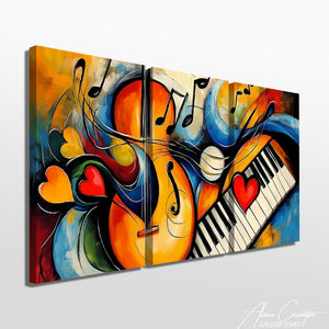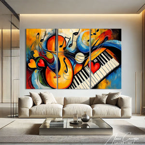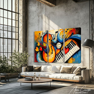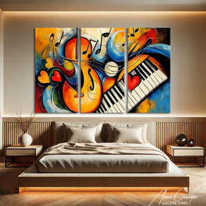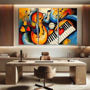Notre tableau 3 parties salon illustre un piano et un violon en version abstraite. L’alliance de la musique et de l’art contemporain crée une atmosphère harmonieuse et élégante.Un tableau qui apaise et inspire au quotidien. Ideal pour les passionnés de musique et de design.