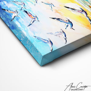Notre tableau abstrait mer capture coucher de soleil océanique ! Cette œuvre marine transforme votre intérieur en galerie d'art côtière apaisante romantique. L'horizon sublimé avec mouettes qui transportent vers l'évasion maritime. L'art marin qui ressource !