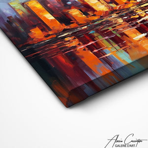 La composition harmonieuse des éléments, tels que les gratte-ciels emblématiques ainsi que l'architecture, confère une esthétique sophistiquée et équilibrée pour ce tableau abstrait moderne de New York