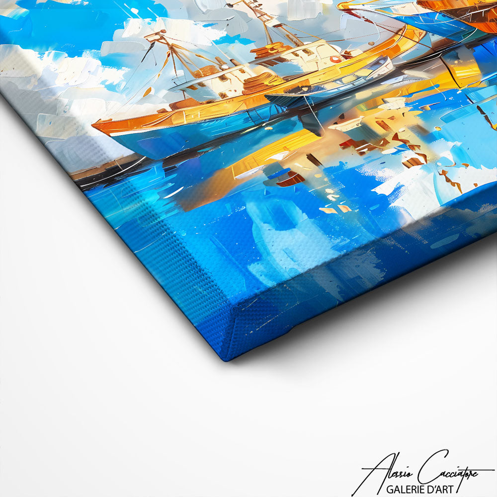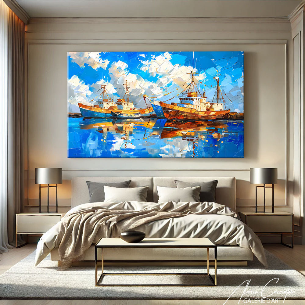 Ce tableau bateau de pêche illustre la simplicité et le charme des scènes maritimes traditionnelles. Avec des détails authentiques et une palette de couleurs naturelles, il évoque la vie au bord de l’eau avec une touche rustique.