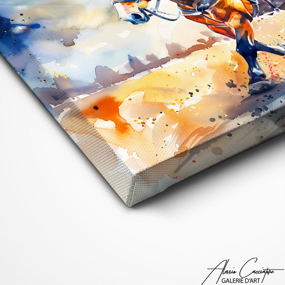 Ce tableau style aquarelle de cheval présente des nuances délicates et des textures douces qui rendent hommage à la majesté de l'animal. Idéal pour un intérieur apaisant et artistique, elle apporte une touche de légèreté et de finesse
