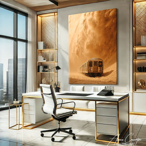 Notre tableau déco bureau adulte représente un train traversant une tempête de sable. Une scène puissante et dramatique qui dégage énergie et intensité. Une création idéale pour une décoration marquée et spectaculaire.