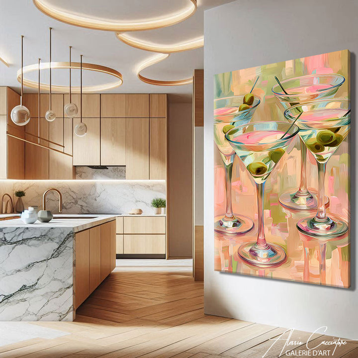 Notre tableau déco pour bar met en scène des verres à martini dans une ambiance chic et contemporaine. Une toile idéale pour créer un coin apéritif stylé, entre élégance urbaine et esprit lounge. Il instaure une atmosphère conviviale et sophistiquée.