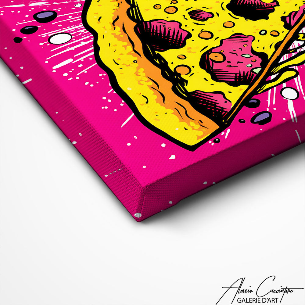 Présenté à travers l'esthétique colorée et exubérante du pop art ce tableau pizza apporte une touche de fantaisie et de couleur, en transformant un sujet quotidien en une œuvre d'art captivante qui stimule l'appétit autant que l'imagination.