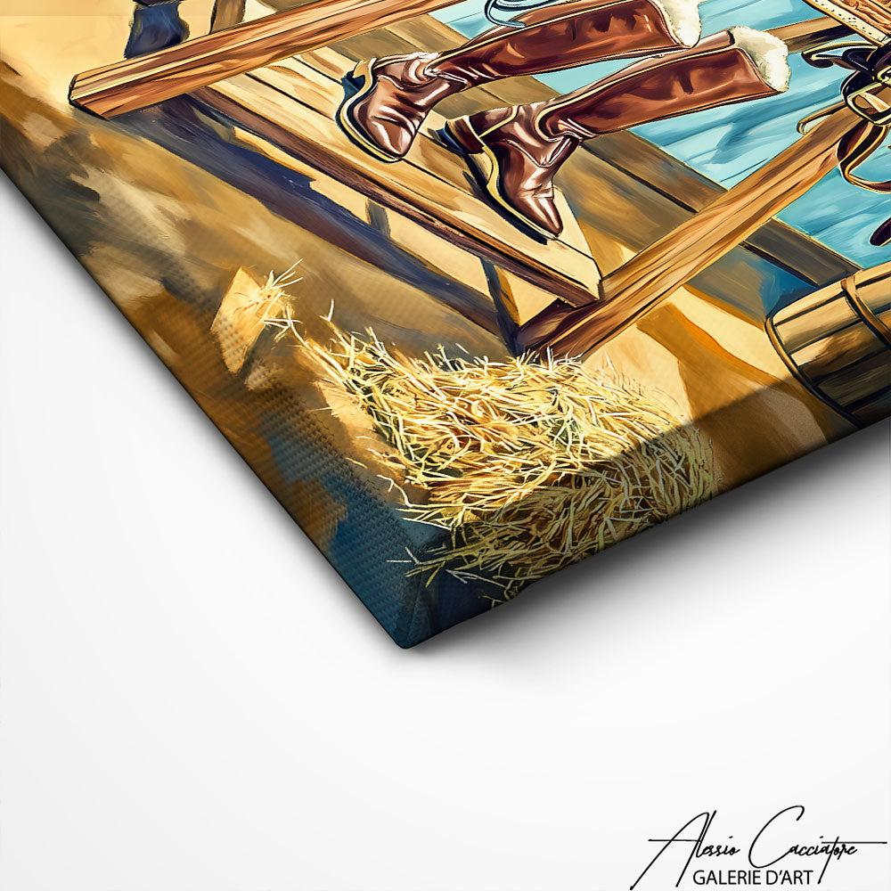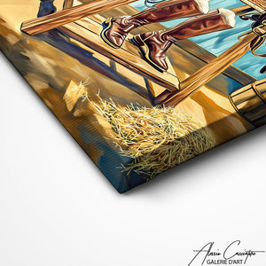 Notre tableau équestre vintage représente une selle soigneusement installée sur un support en bois, accompagnée de bottes parfaitement alignées. La lumière venant de la fenêtre apporte une atmosphère calme et authentique. Chaque détail de l’équipement est mis en valeur avec précision. Une scène élégante qui transmet passion et respect du monde équestre.