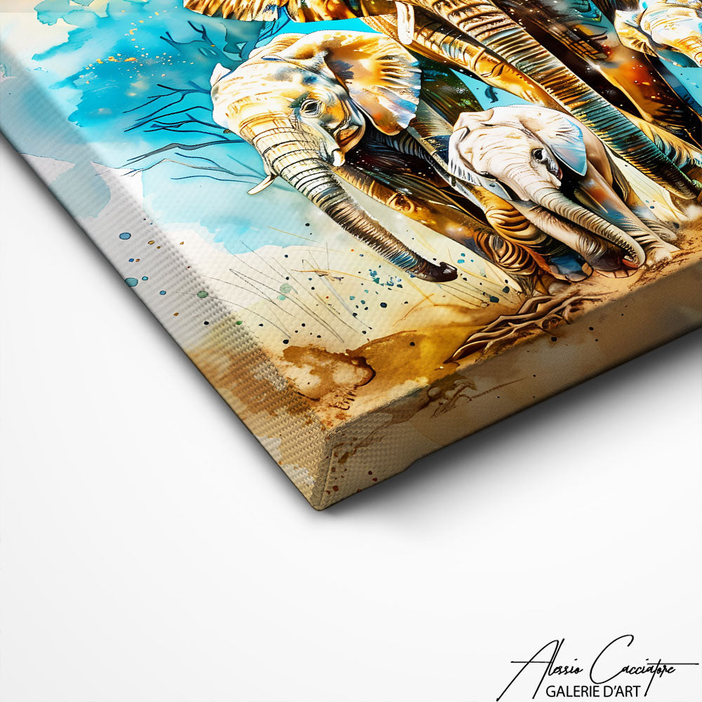 Ce tableau famille éléphant capture la tendresse et la solidarité de ces animaux majestueux. Parfait pour une atmosphère chaleureuse et conviviale, il symbolise la protection, l’unité et l’amour familial, apportant une ambiance apaisante à votre espace.