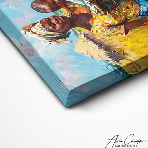 Ce d'une femme africaine avec son bébé illustre la tendresse maternelle dans un contexte africain, capturant l'instant précieux partagé entre une mère et son enfant. Ce tableau est un hommage à l'amour familial, parfait pour ajouter une note d'émotion et de beauté à votre intérieur.