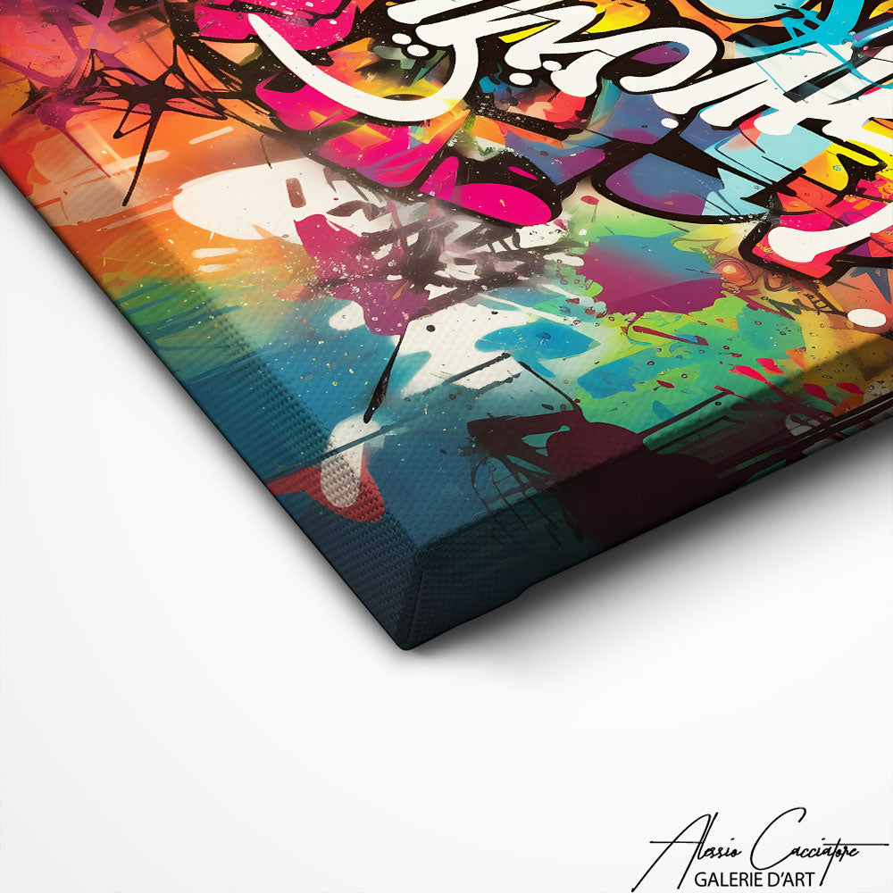 Ce tableau de graffiti contemporain offre une vision moderne et avant-gardiste de cet art de rue. Les formes abstraites et les couleurs vibrantes se combinent pour créer une œuvre d'art qui capte l'attention.